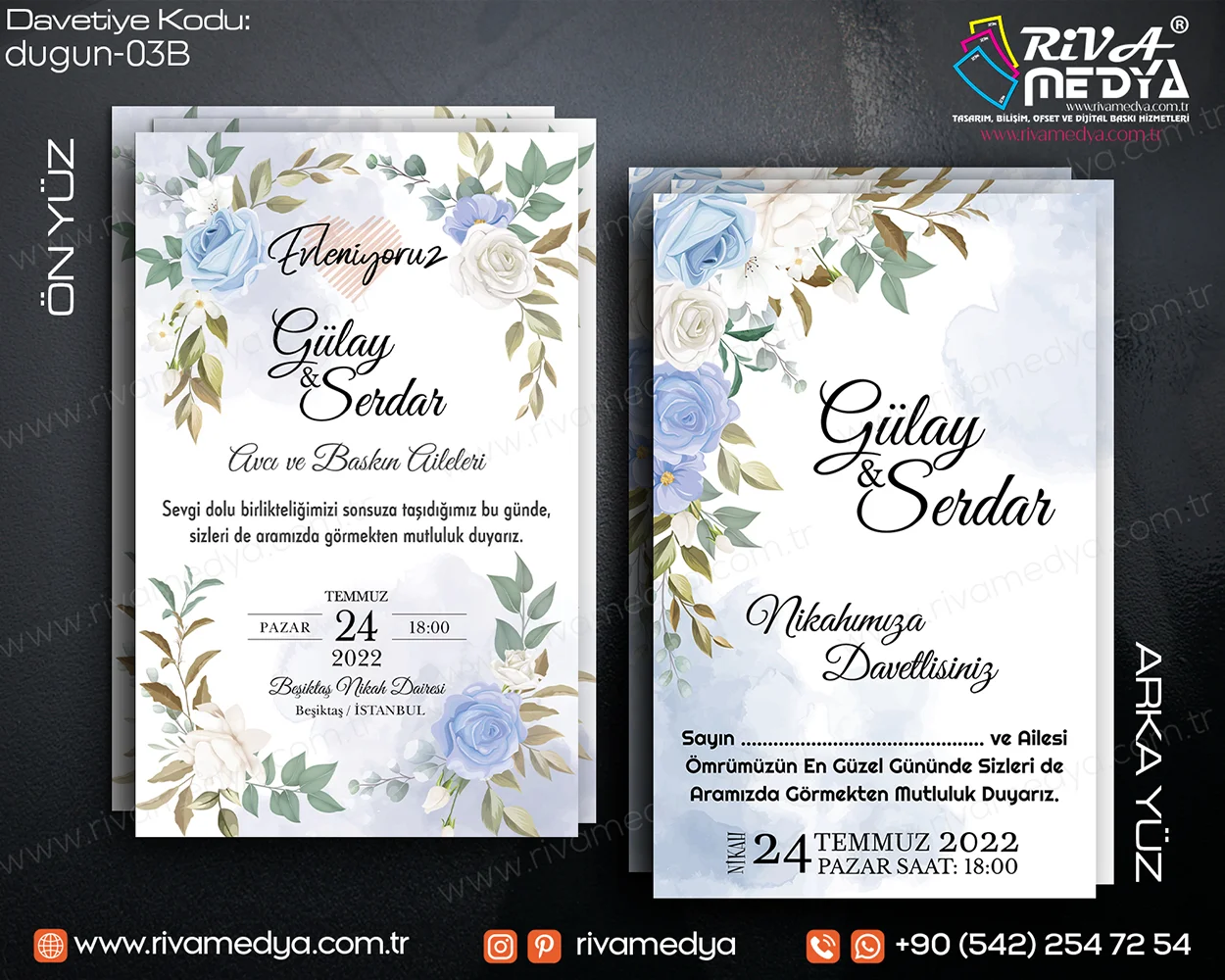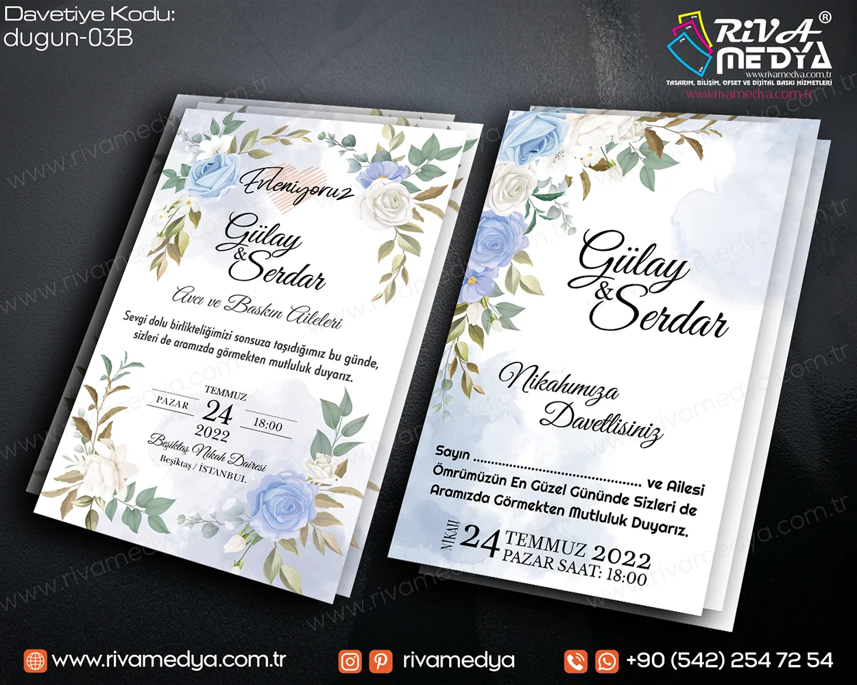 En özel gününüz için sade, zarif ve romantik çizgilerle hazırladığımız Gül Desenli Gökyüzü Mavisi Zarif Düğün – Nikah Davetiyesi örneğini sizler için en uygun fiyatlarla sunmaktayız.